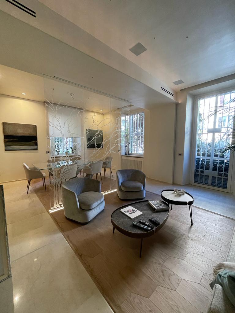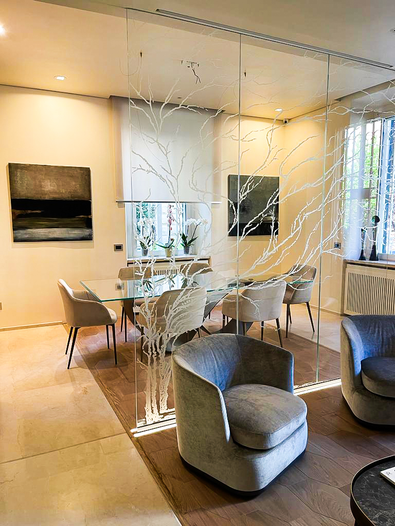 L’ampio salone è stato diviso da un’eterea vetrata che separa la zona pranza dalla conversazione, su cui è inciso un tenue decoro naturalistico.