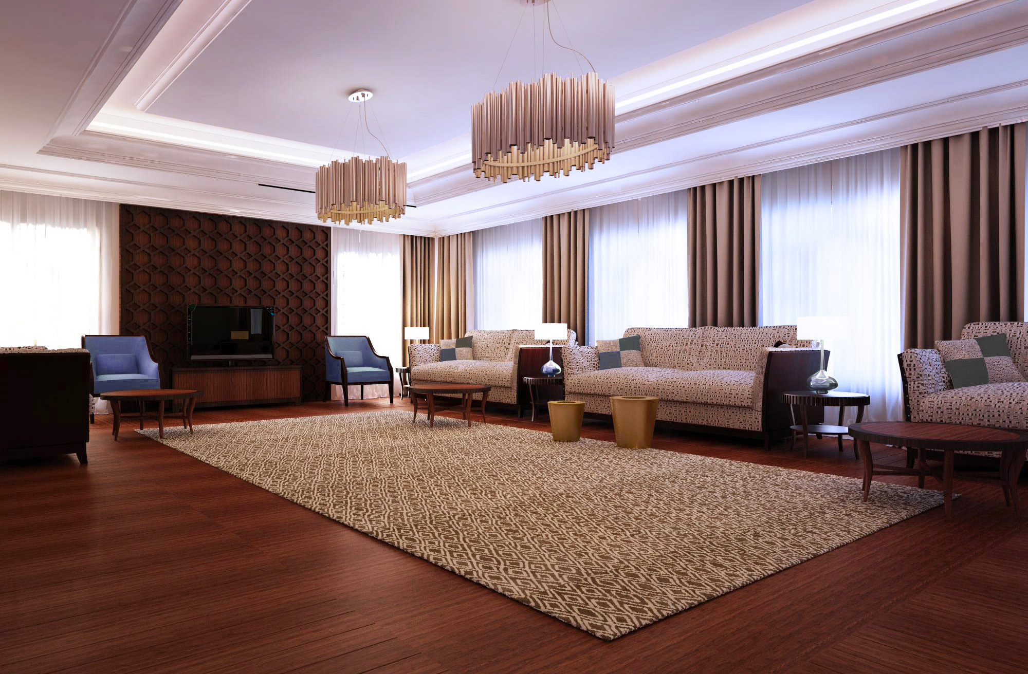 Anche il “Majlis” è scaldato dai morbidi toni del beige delle tappezzerie e del tappeto, tessuto sul disegno che riprende il motivo della “musharabia” in noce sullo sfondo.